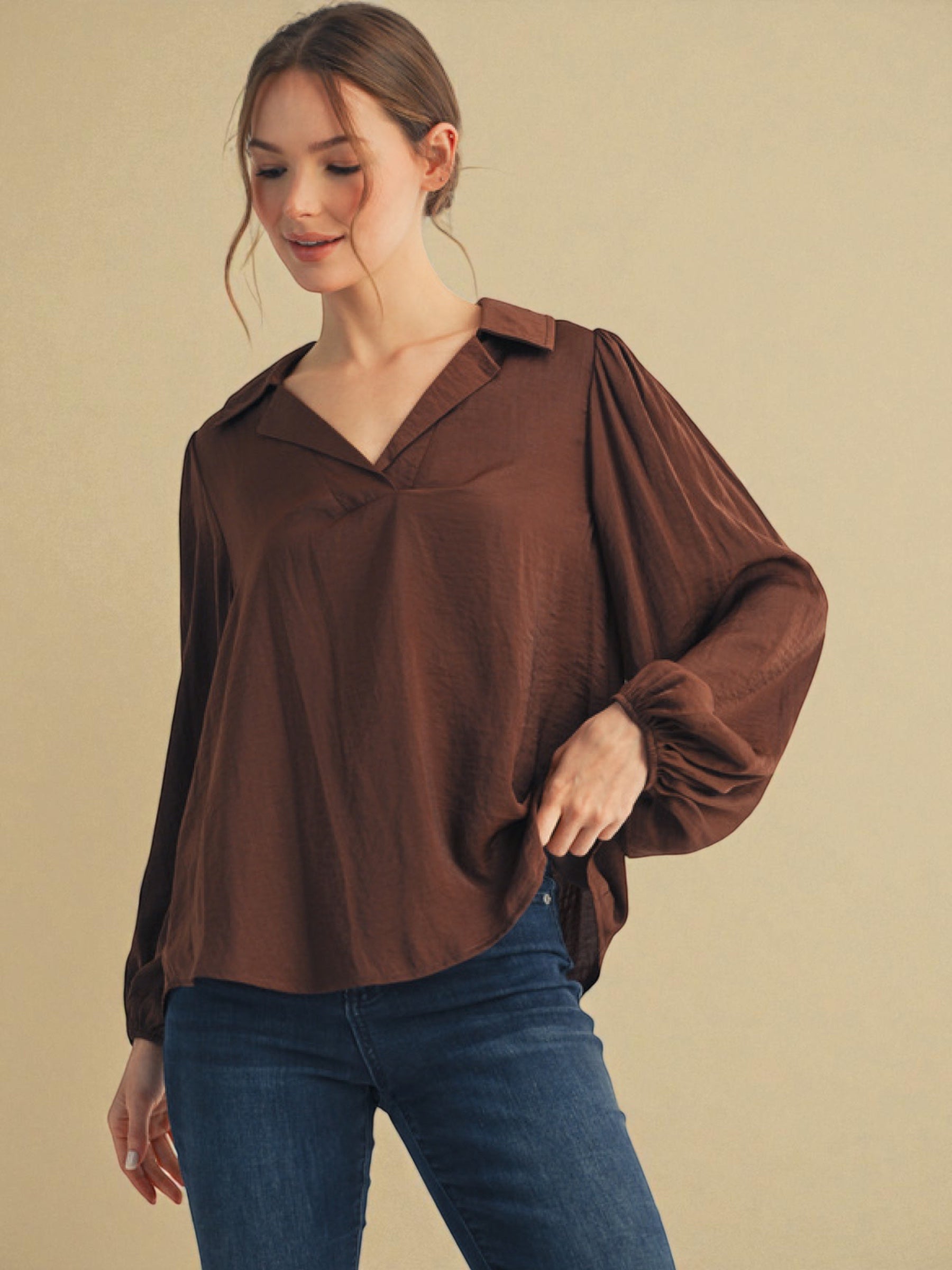 Long puff sleeves v neck textured fabric solid top, collared neckline.