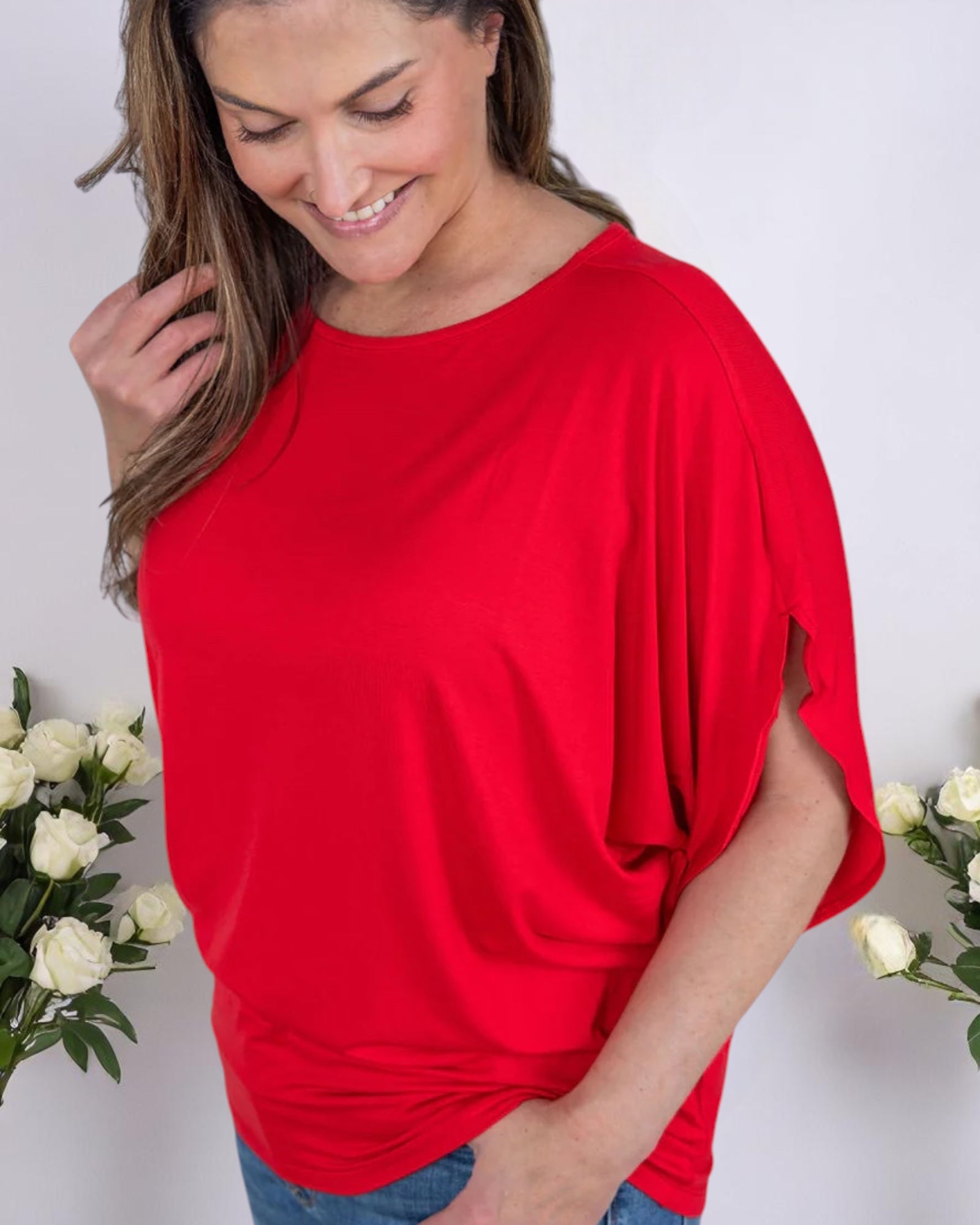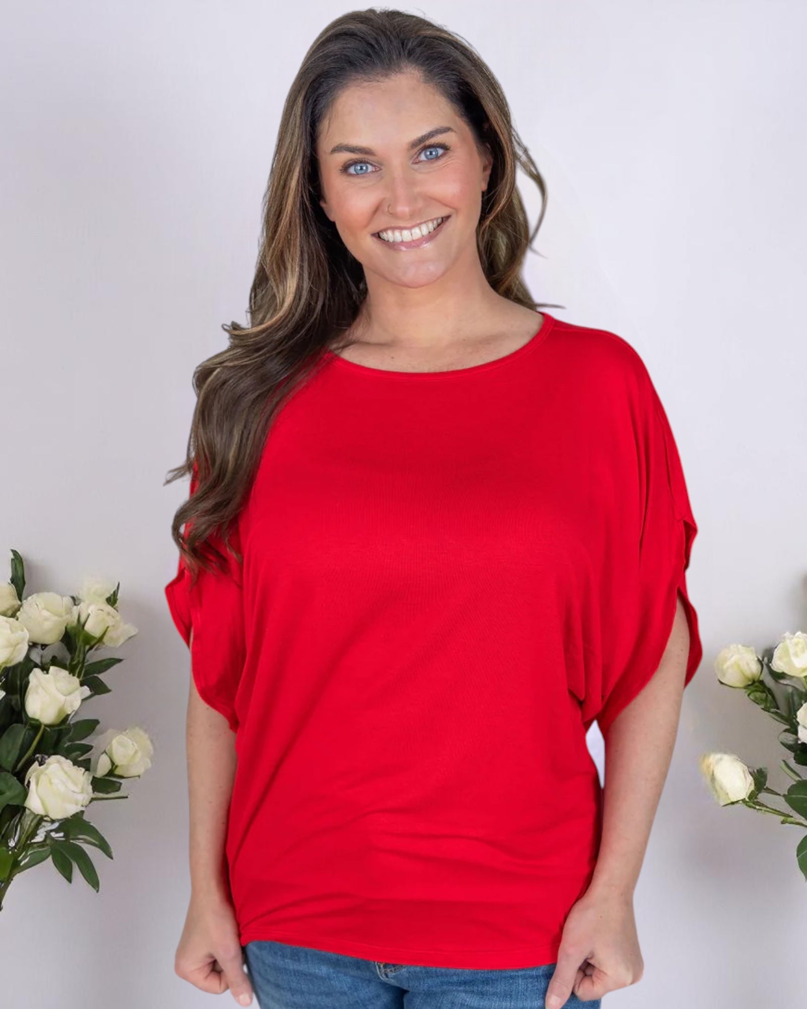 Classic and versatile, the red Darcy Dolman top is perfect for any work or play. Flowy sleeves and a stylish design make this look perfect for day to night. Look and feel beautiful in this easy-to-wear top, whether it is a go-to top for work, attending a holiday party, or having date night out-you will love this top! Plus, it has amazing stretch for that comfortable feel we all love.