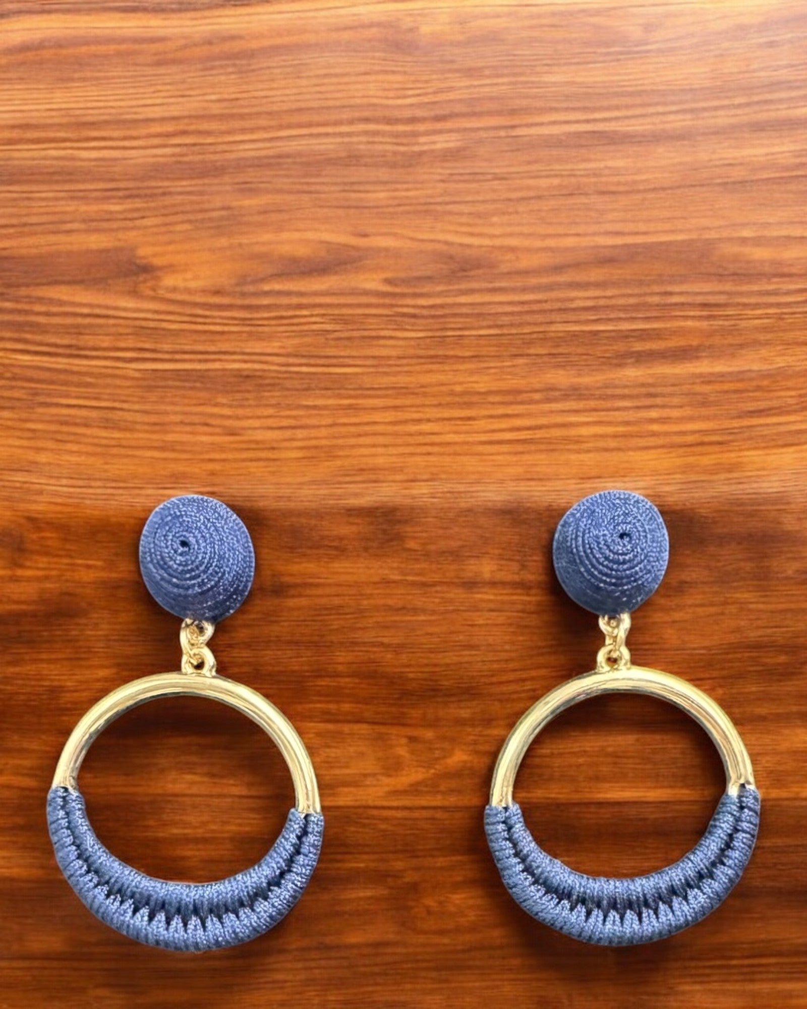 Navy wrapped and gold dangle post earrings.