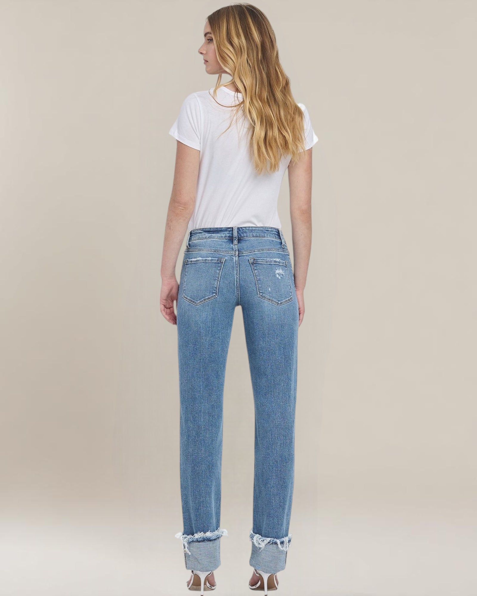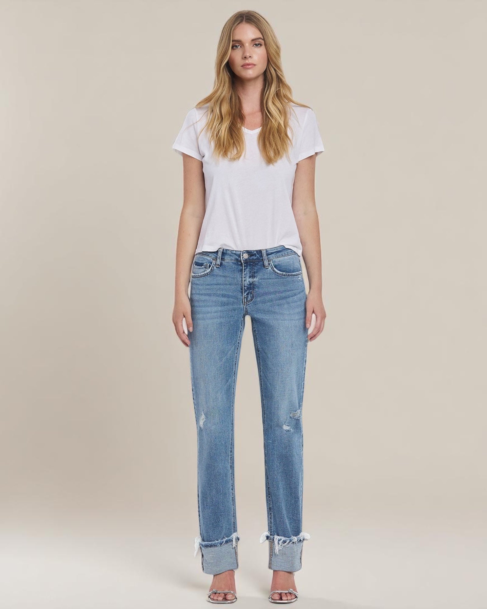 MID RISE CUFFED STRAIGHT JEANS COMFORT STRETCH DENIM, MID RISE WAIST, DISTRESSED DETAIL, SINGLE CUFF HEM, FULL LENGTH, STRAIGHT JEANS F.