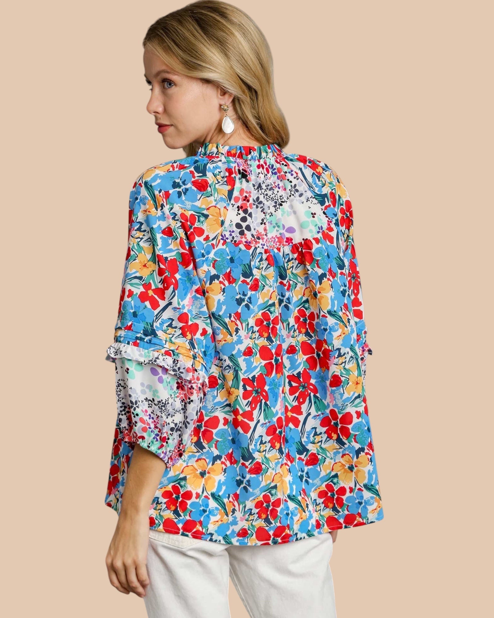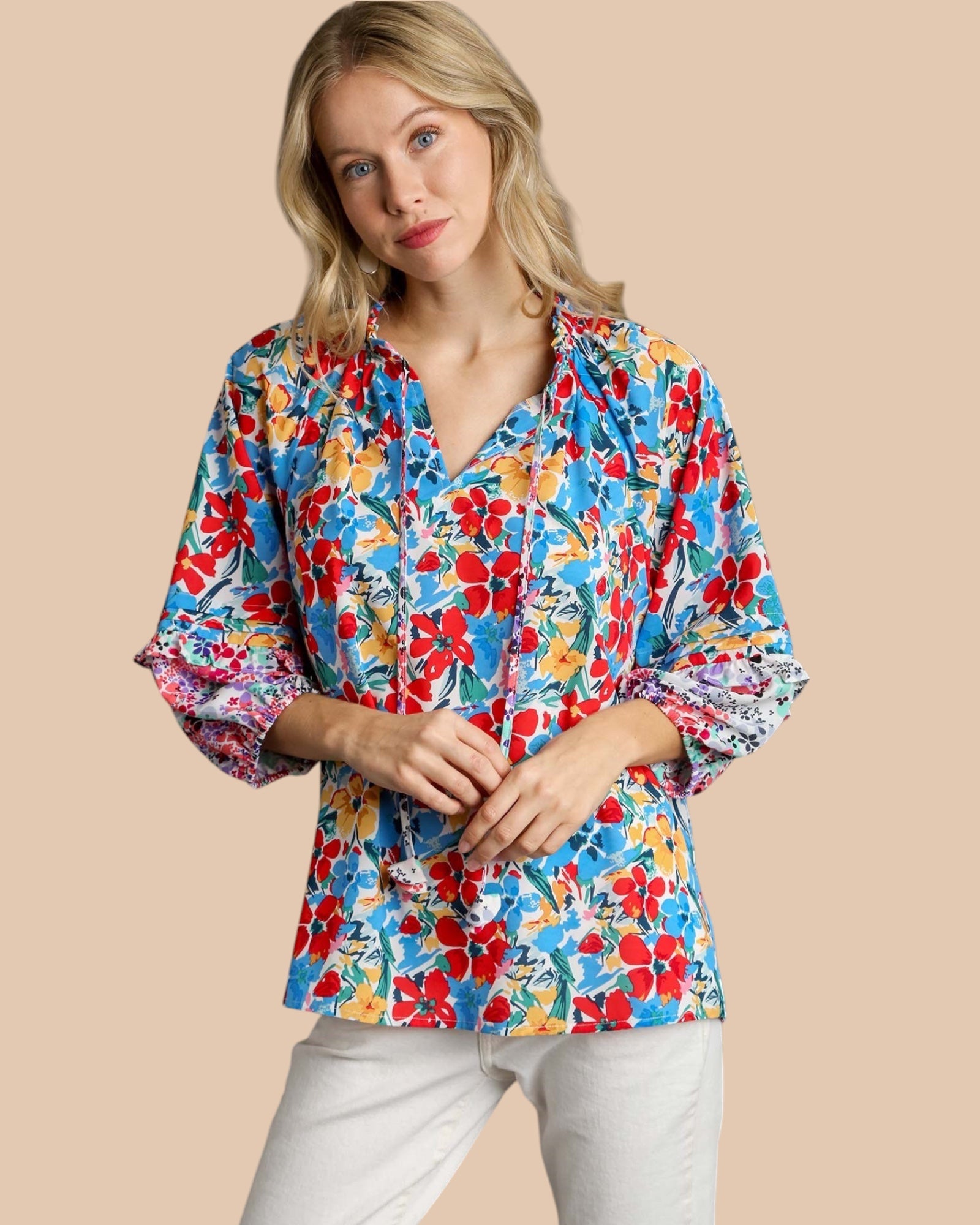 Boxy Cut Floral Mixed Media 3/4 Sleeves with Pin-Tuck & Front Tie Drawstring
