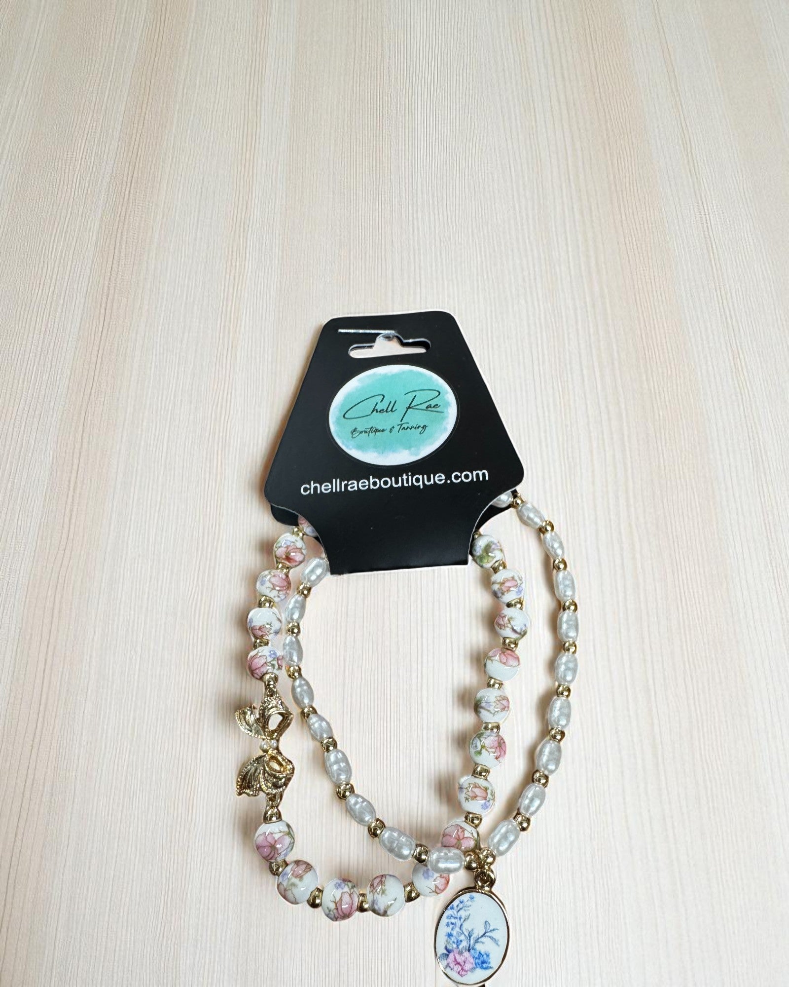 This whimsical bracelet set combines lustrous pearls with charming floral- patterned beads, creating a perfect accessory for any cottage-core enthusiast. With a delicate gold-toned bow and an intricate floral medallion charm, it's a lovely way to add a touch of romantic elegance to you look.