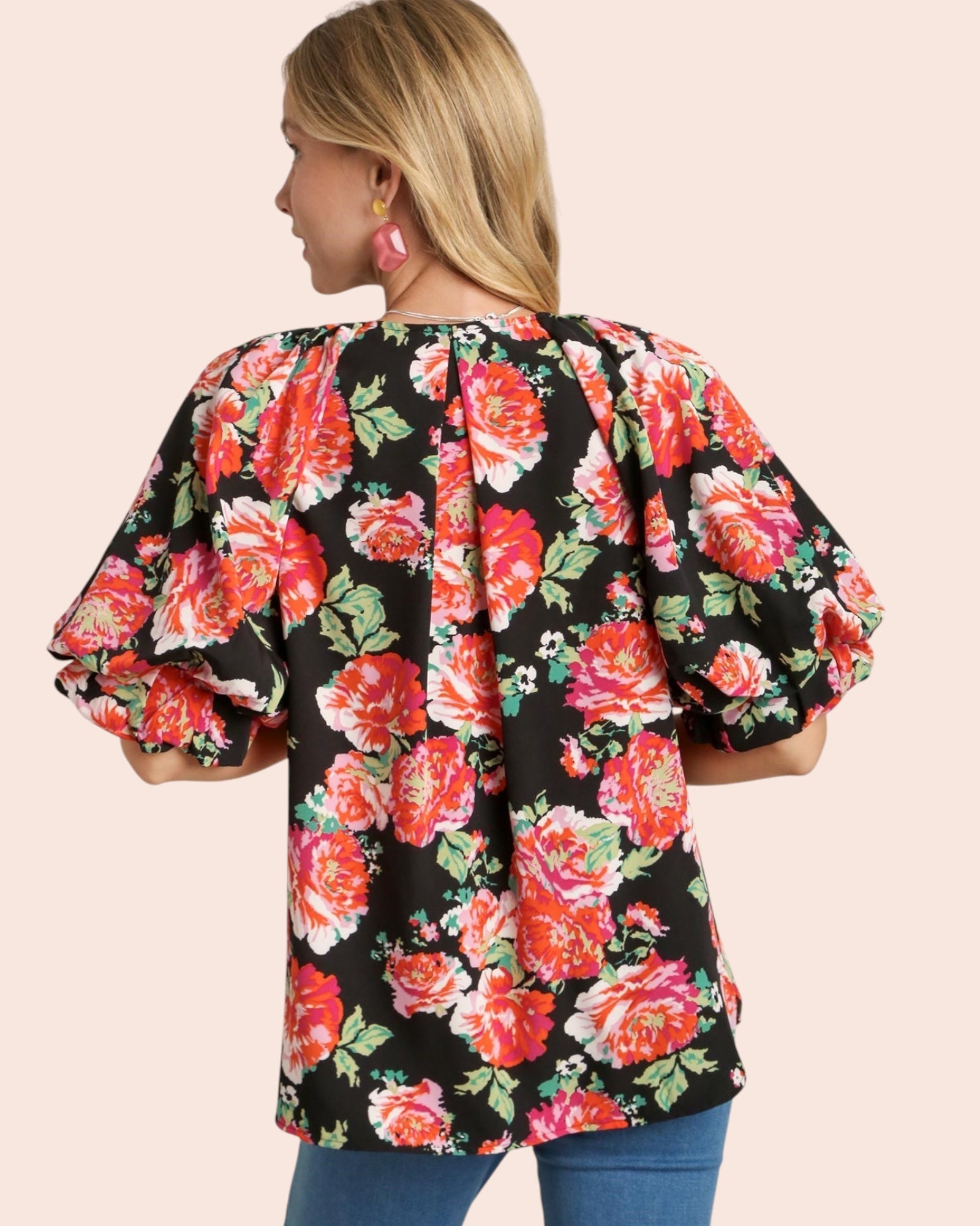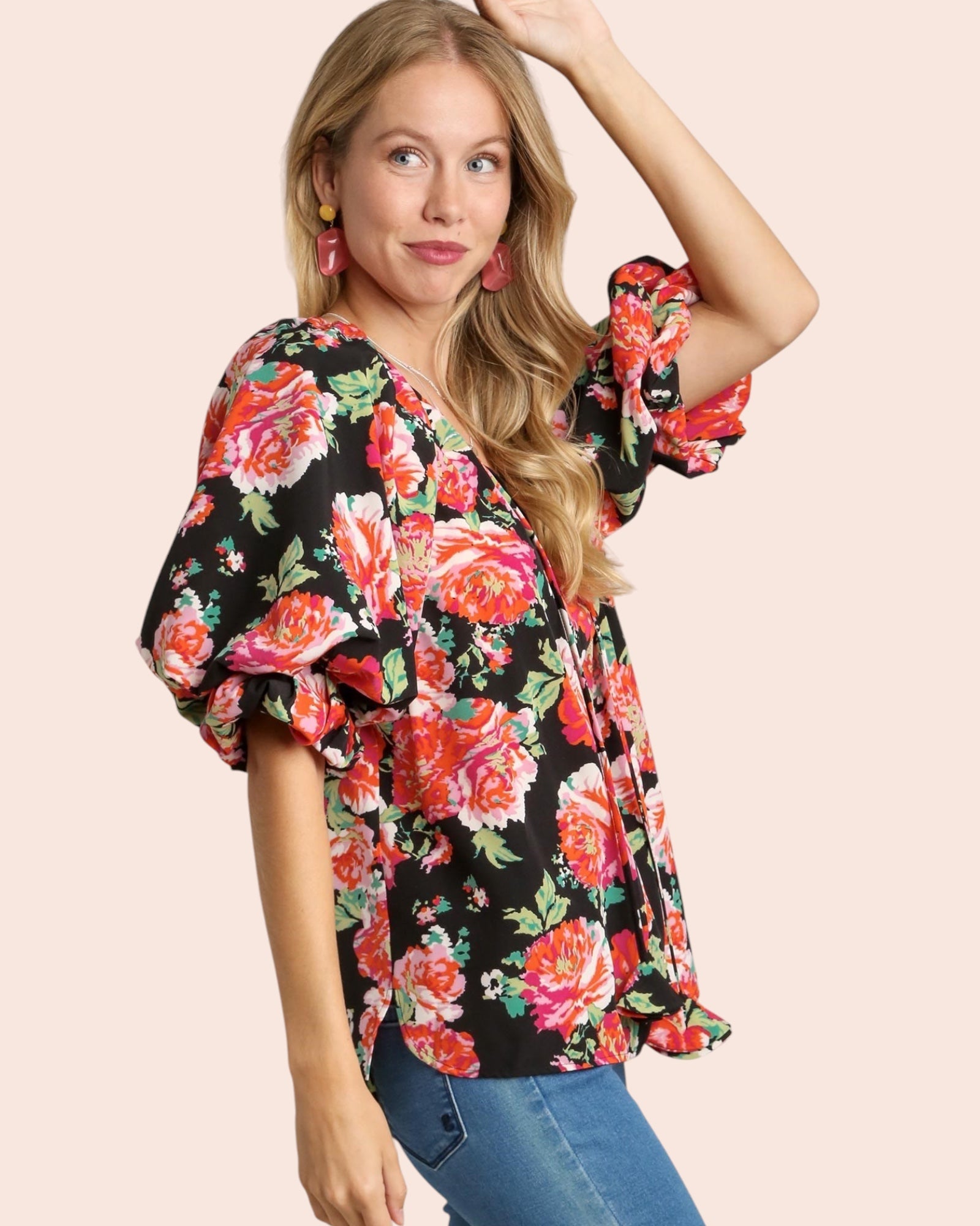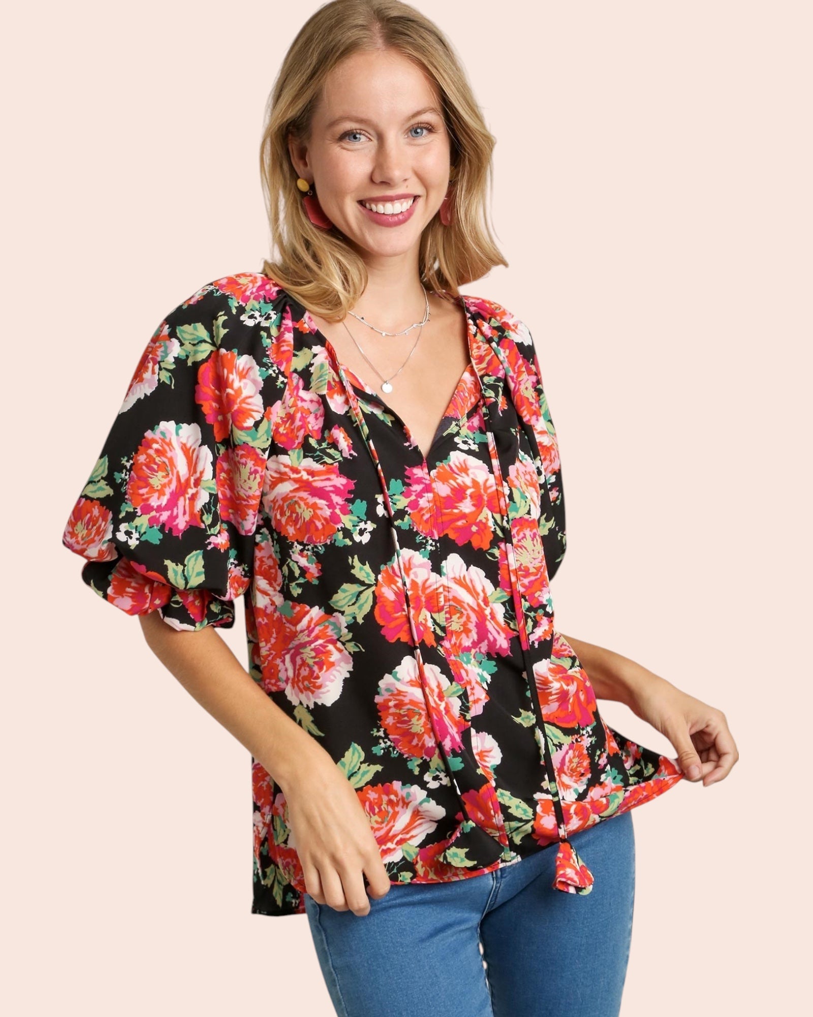 Floral Print Split Neck Top with Side Slit , Balloon Short Sleeve, & Front Drawstring
