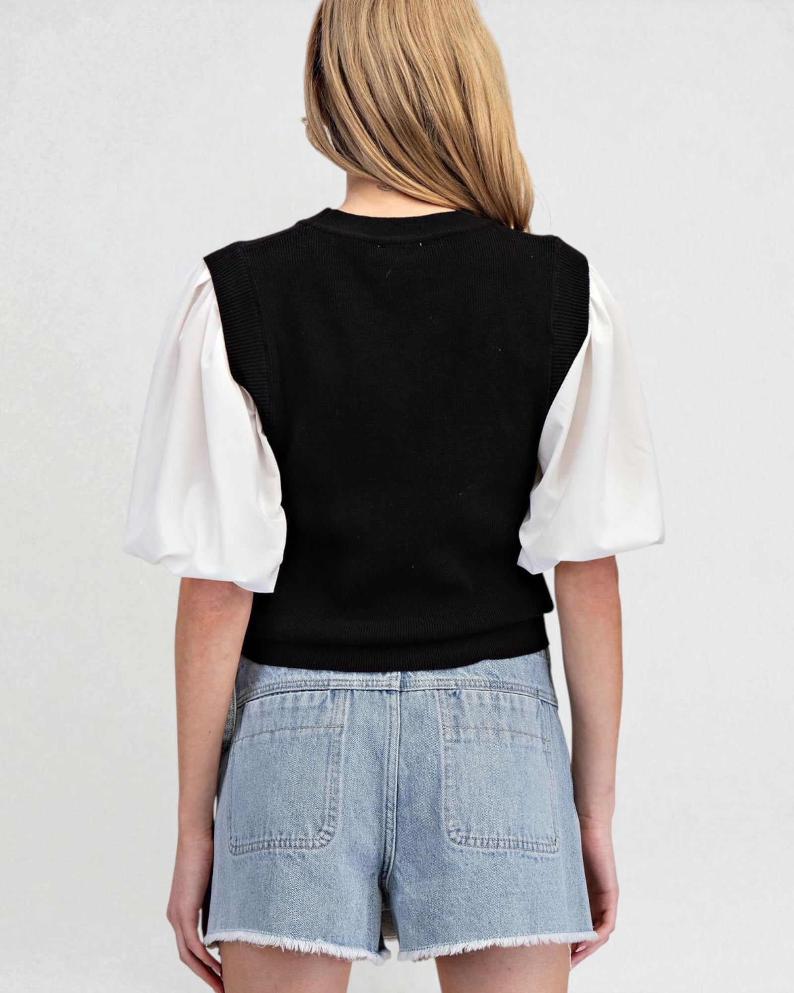 Two toned half sleeve sweater top featuring a rounded neckline, contrasting bubble sleeves with ribbed cuffs, a banded bottom, is ribbed throughout and is a relaxed fit body.