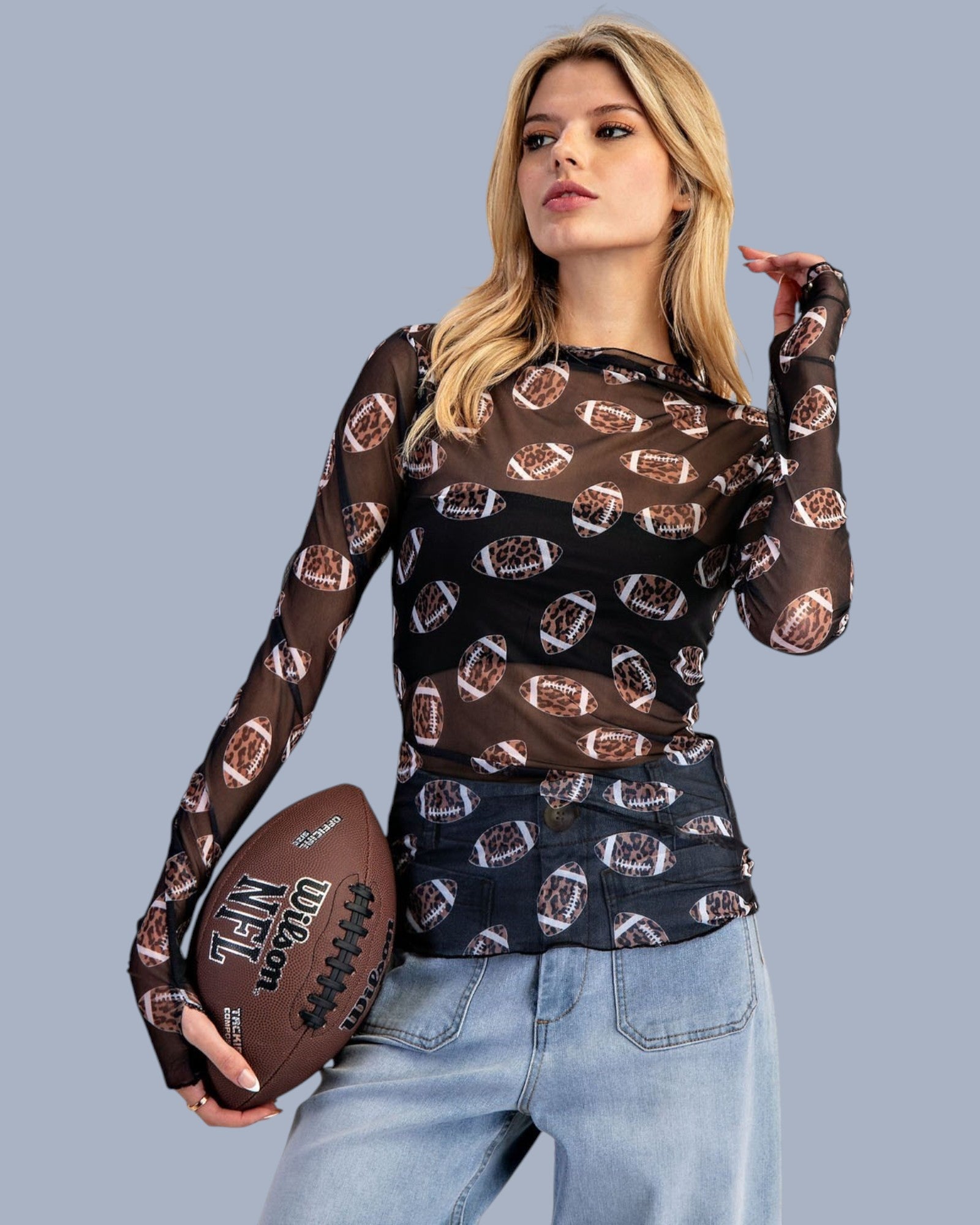 Product Detail: This sheer mesh top features a fitted silhouette with an allover leopard football print, raw edge finishings, and thumbhole cuffs for a sporty meets playful statement layer.