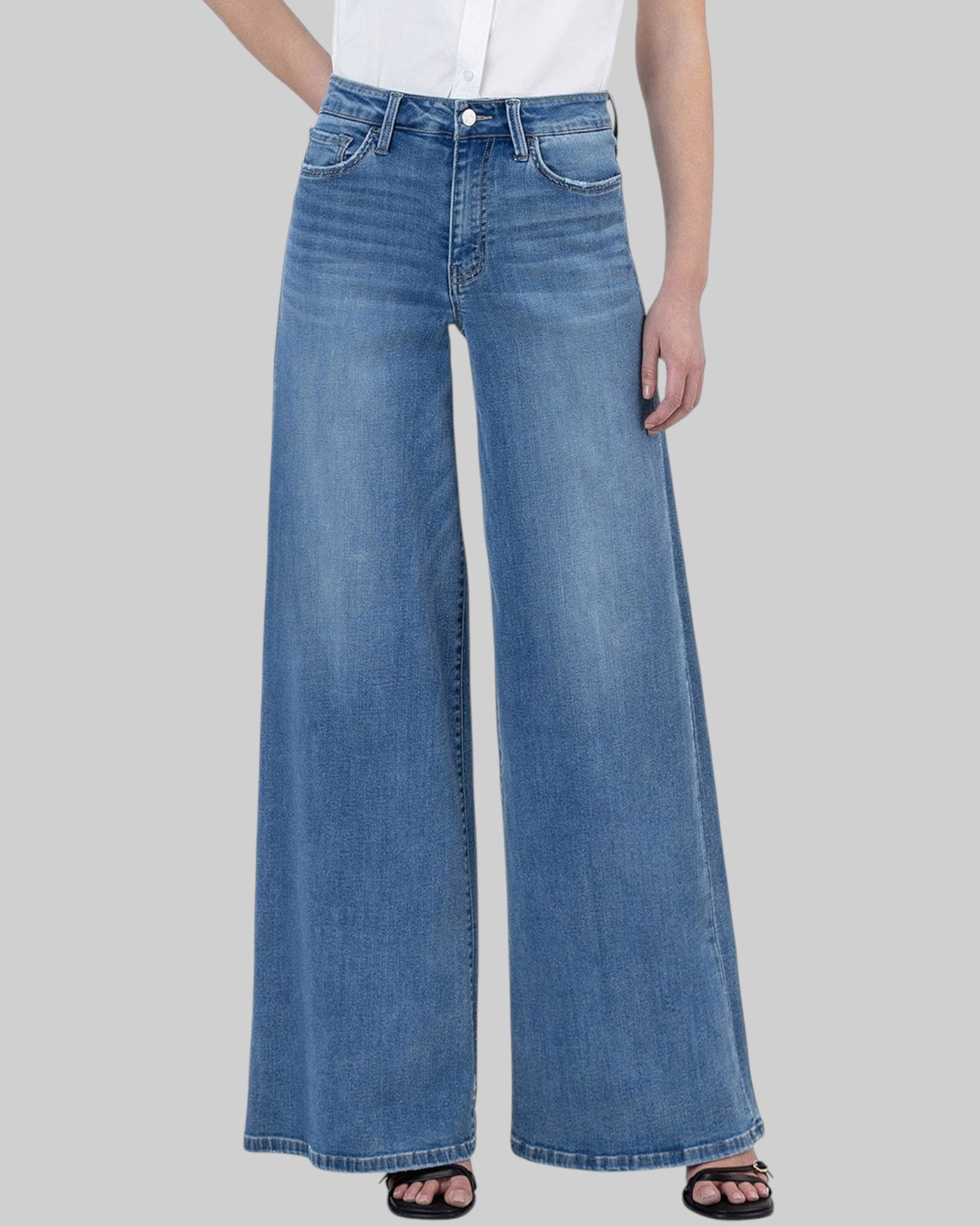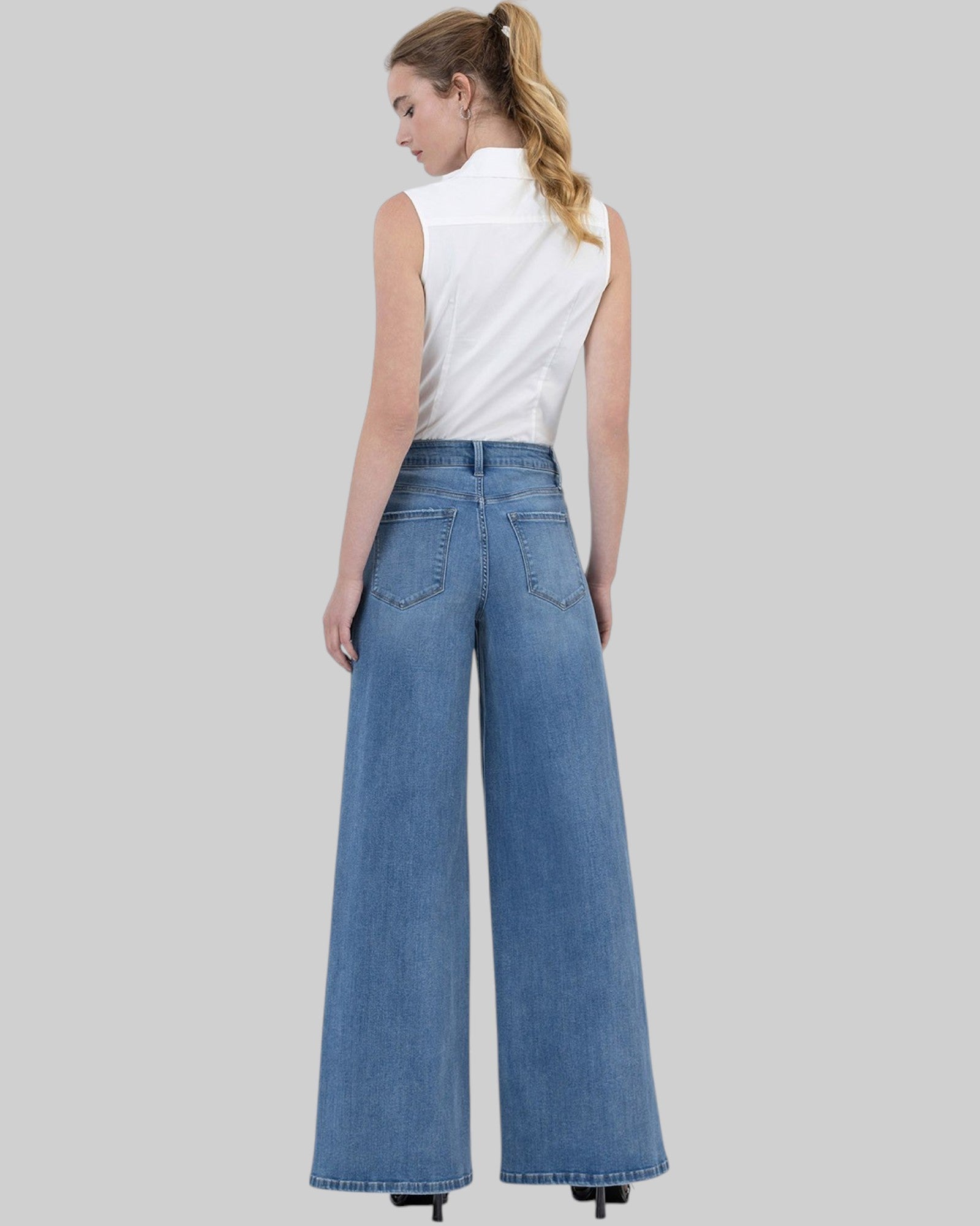 HIGH RISE FULL LENGTH PALAZZO JEANS COMFORT STRETCH DENIM, HIGH RISE WAIST, FINISHED HEM, FULL LENGTH, PALAZZO JEANS