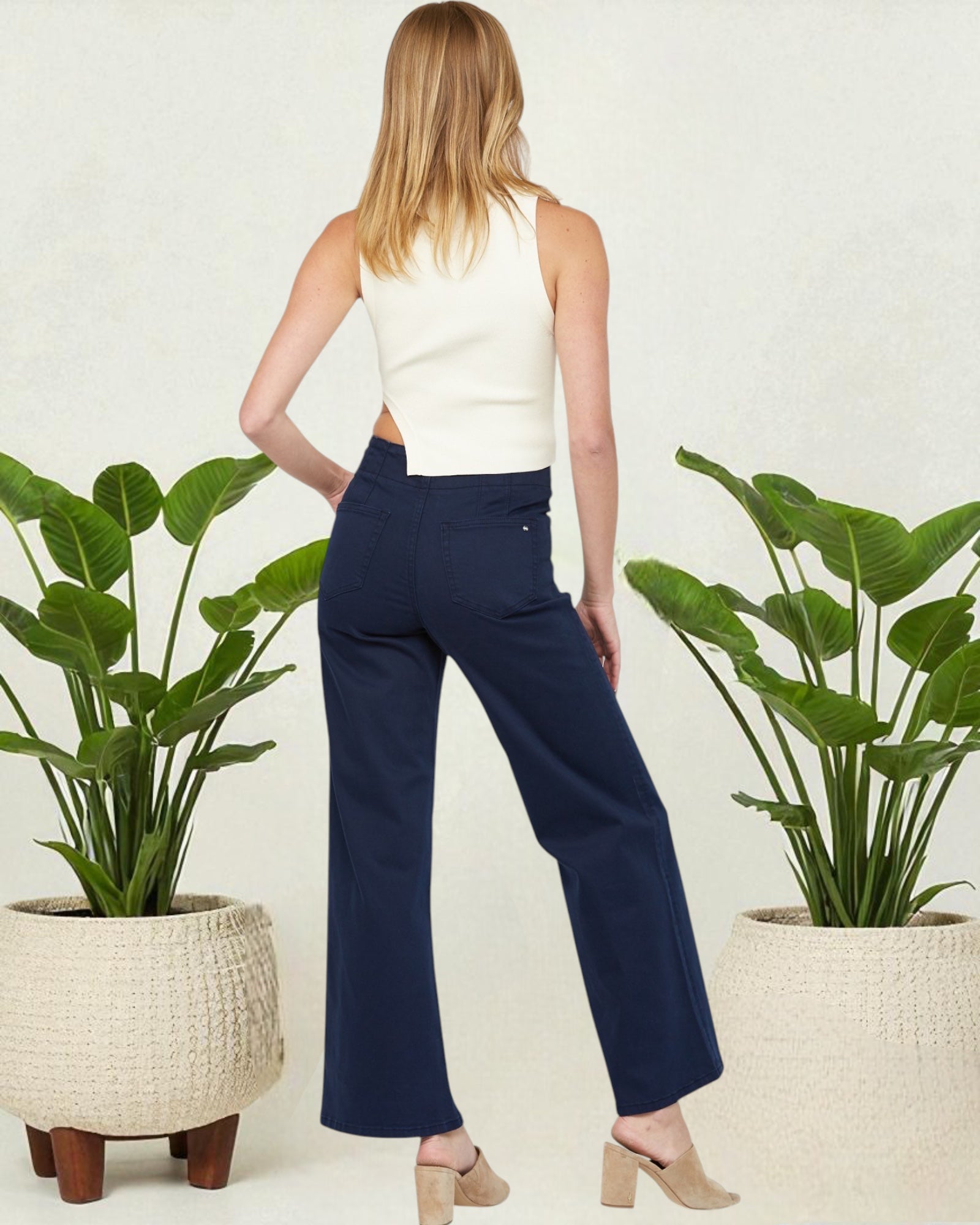 HIGH-RISE WIDE LEG 98% COTTON, 2% SPANDEX FRONT RISE : 11" INSEAM : 31" LEG OPENING : 21"