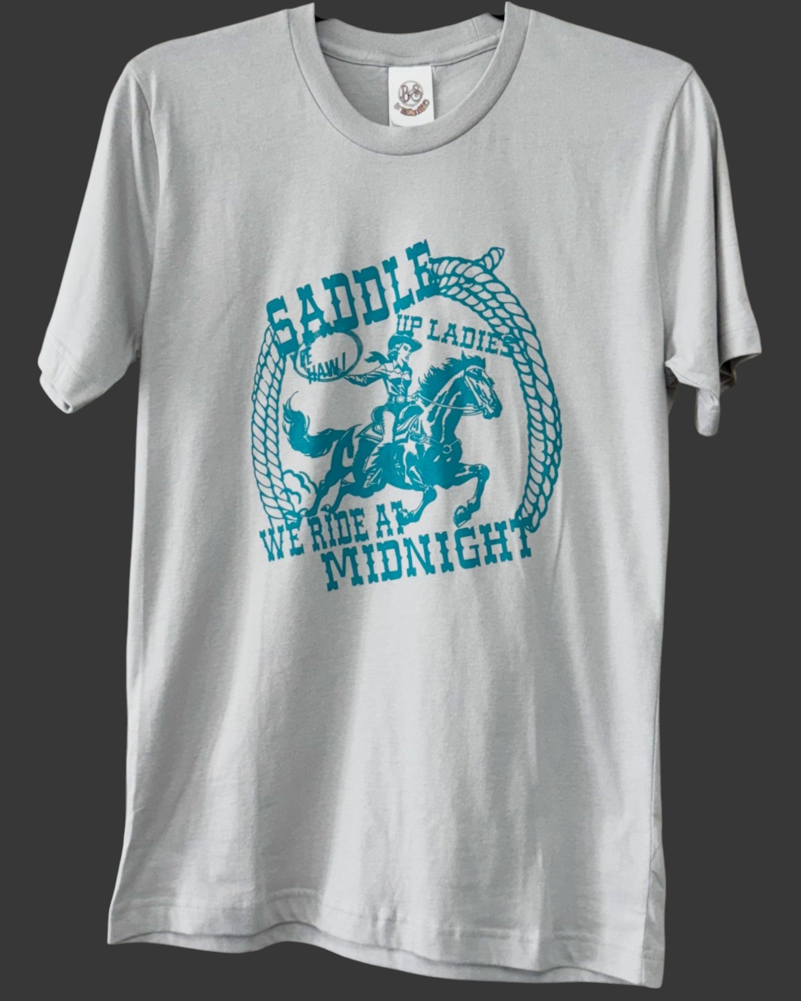 Comfort soft grey tee shirt with turquoise wording "Saddle up Ladies we ride at midnight"